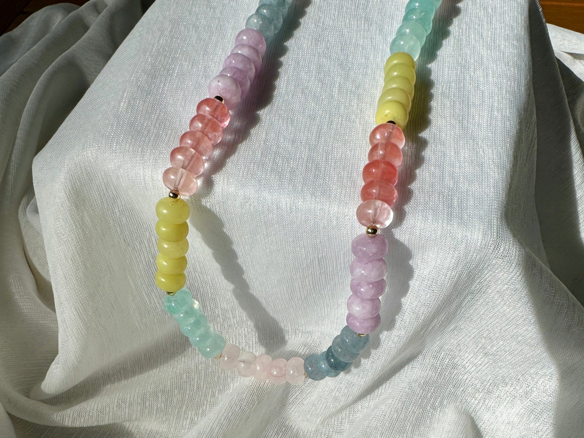 Rondelle natural stones: Sodalite, red watermelon, morganite, lemon jade, aquamarine, and amazonite.